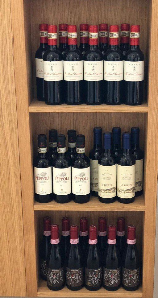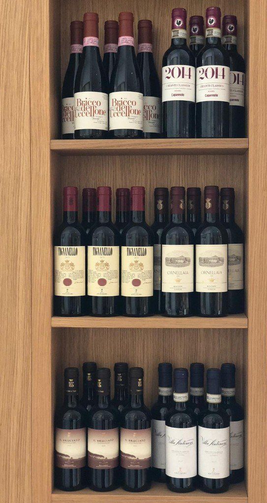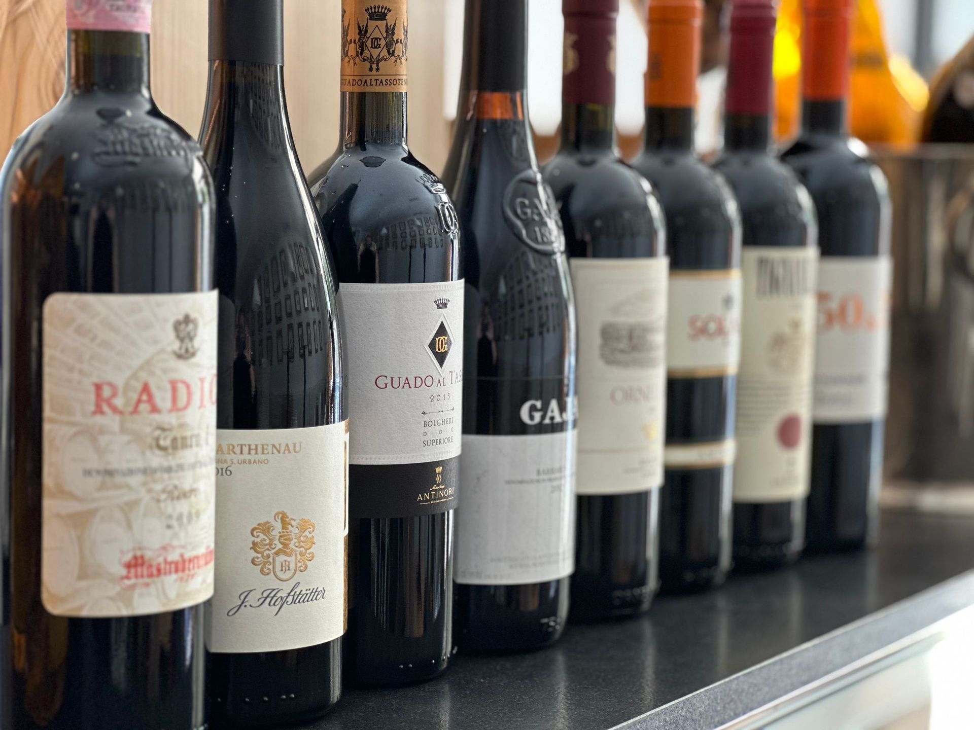 Per quel che riguarda i vini, il locale dispone di importanti etichette come: Felluga, Cervaro della Sala, Hofstatter, Ca' Del Bosco, Capichera, Sanct Valentin, Solaia, Ornellaia, Gaja, Tignanello, Avvoltore, Luce Brunello di Montalcino, 50/50 Avignonesi, Bruciato di Bolgheri e tanto altro.